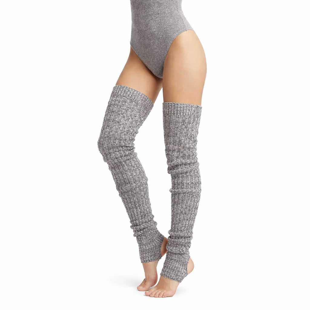 Practice with style in these extra long ribbed leg warmers! Perfect for Pilates, Barre, dance classes, or simply making a style statement. You'll love the eye-catching marl pattern of two complementary colors, a beautiful pale pink and grey.